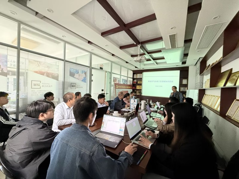 培訓(xùn)中,沈老師簡要介紹了本次培訓(xùn)的目的,并結(jié)合氣體設(shè)備市場,重點介紹了常溫空氣分離工藝基礎(chǔ)知識、常溫空氣分離(變壓吸附及膜)工藝及設(shè)備、碳分子篩及變壓吸附制氮技術(shù)、壓縮空氣膜干燥工藝及設(shè)備等知識,通過深入淺出的現(xiàn)場講解和提問方式,鼓勵學(xué)員們主動思考、積極發(fā)言。