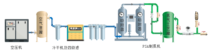 空壓機(jī)→空氣緩沖罐(濕罐)→C級(jí)過(guò)濾器→冷凍式干燥機(jī)→T級(jí)過(guò)濾器→A級(jí)過(guò)濾器→H級(jí)過(guò)濾器→制氮機(jī)主機(jī)→氮?dú)饬髁?,純度,壓力檢測(cè)→氮?dú)鈨?chǔ)氣罐→使用點(diǎn)