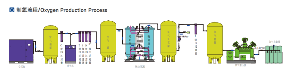 變壓吸附制氧裝置以潔凈的壓縮空氣為原料,采用高品質的沸石分子篩作為吸附劑,在一定的壓力下,從空氣中制取氧氣。經(jīng)過純化干燥的壓縮空氣,在吸附器中進行加壓吸附、減壓脫附。由于空氣動力學效應,氮在沸石分子篩微孔中擴散速率遠大于氧,氮被沸石分子篩優(yōu)先吸附,氧在氣相中被富集起來,形成成品氧氣。然后經(jīng)減壓至常壓,吸附劑脫附所吸附的氮氣等雜質,實現(xiàn)再生。一般在系統(tǒng)中設置兩個吸附塔,一塔吸附產(chǎn)氧,另一塔脫附再生,通過PLC程序控制器控制氣動閥的啟閉,使兩塔交替循環(huán),從而取得純度較高的氧氣(93%±3%)。